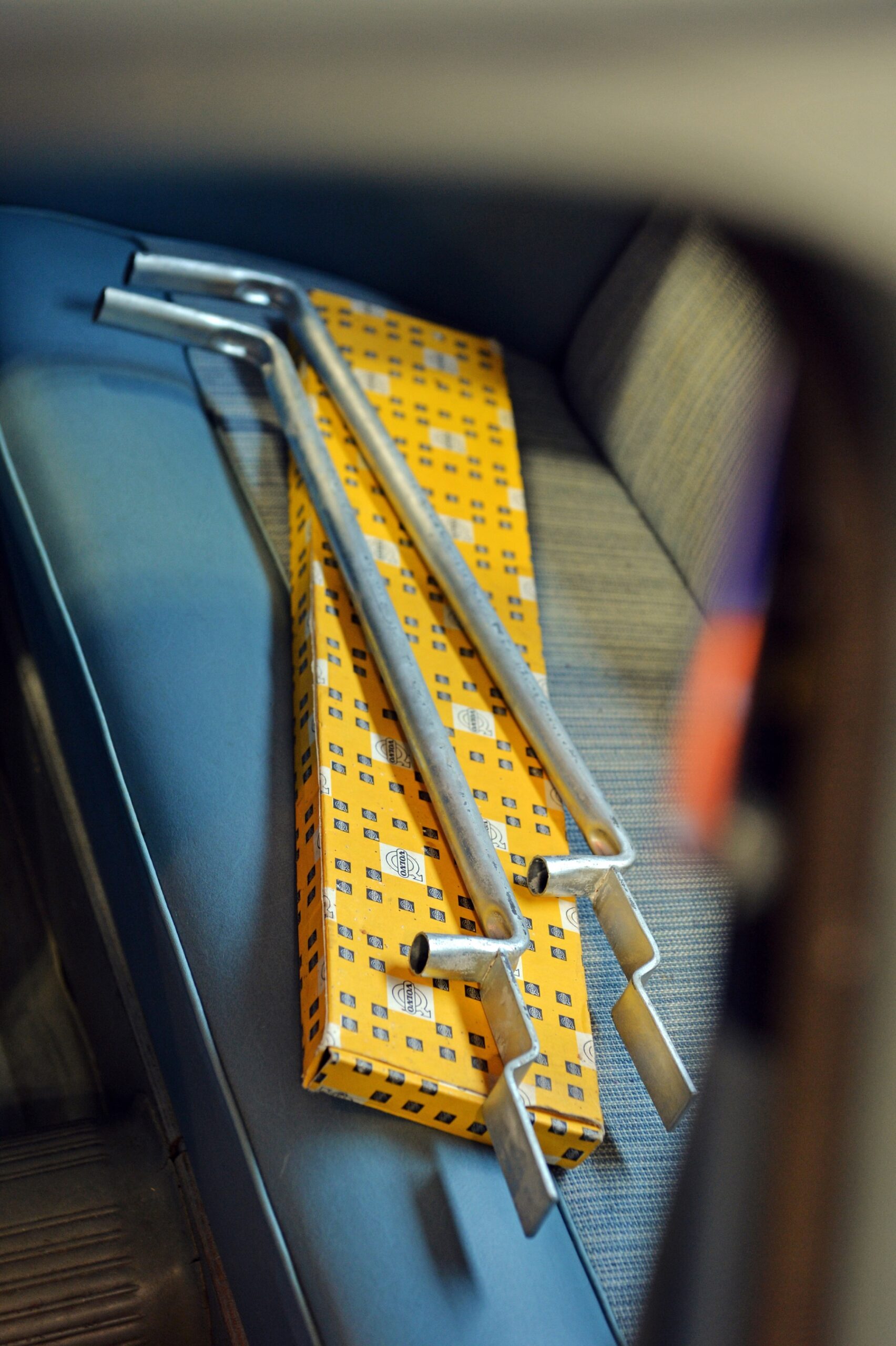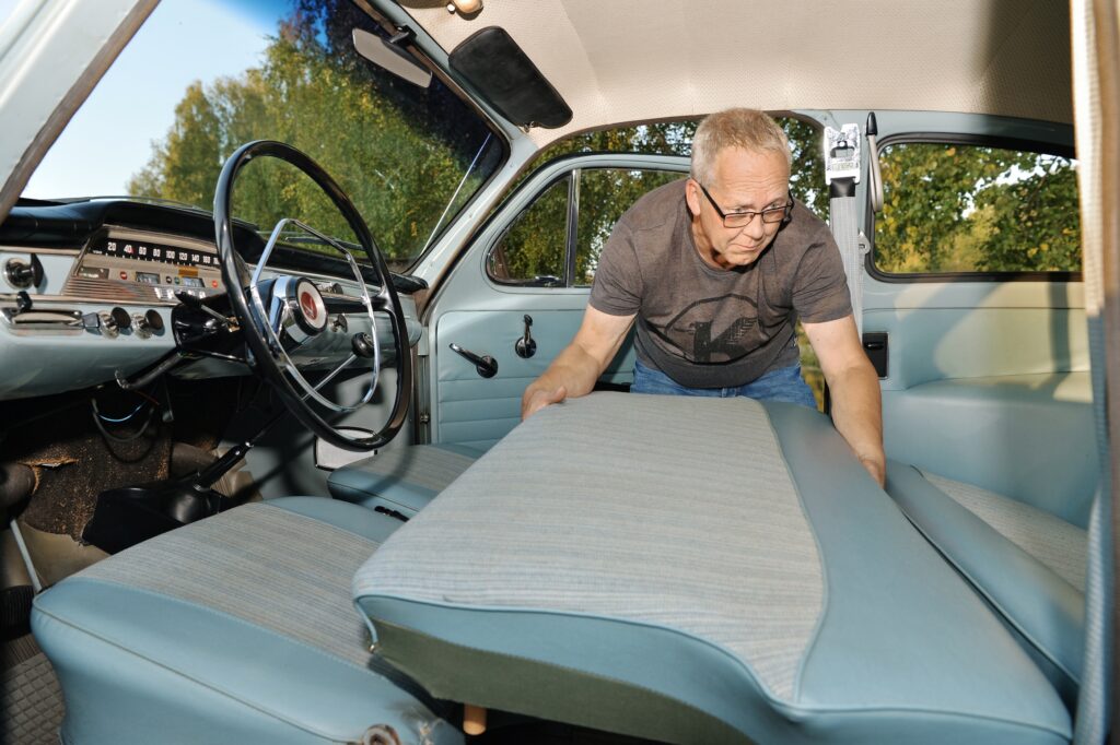 Även om han gjorde som kusinen, aldrig campade i sin PV, så har han testat hur bäddsatsen fungerar. Den gulvita asken innehåller två stålskenor som ska placeras mellan baksätets ram och glid-skenorna för framstolarna. Innan dess plockas ryggstöden fram bort, liksom soffans ryggstöd bak. Soffryggen läggs över bäddskenorna för att bilda en hyfsat plan sovplats.