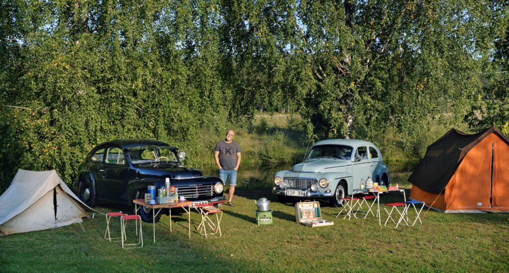 Den äldre campinguppsättningen representeras av hans PV 444 modell A från 1947 med ett ovanligt tvåmanstält i tyg. Referens-campingbilen från 1965 flankeras av ett större orangeblått tält av samtida snitt – för den som inte vill sova i sin PV. Charmen är bedövande. Husvagn, husbil eller hotell är förstås bekvämare, men gemytet hos folkhemscampingen är svårslaget.