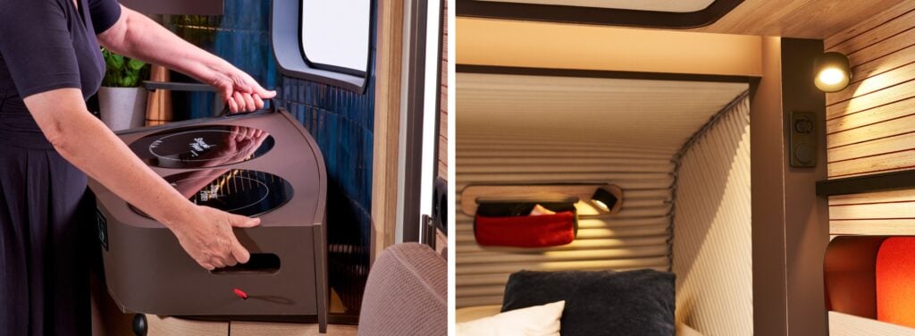 ”Både större och mindre – beroende på målgruppen. Teknikutveckling gör att små husvagnar blir mer funktionella, medan stora och lyxiga kan expandera och bli mer självförsörjande. MINDRE: Fler människor bor i städer, kör elbilar eller mindre fordon vilket kräver lättare och mer kompakta husvagnar. Många lockas av enkelhet och flexibilitet där smarta lösningar som modulmöbler och hopfällbara system gör att små ytor kan användas mer effektivt. STÖRRE: De som reser länge eller vill bo i sin husvagn önskar större utrymme, mer förvaring och bättre isolering. Möjligt att arbeta på distans med mobila kontor, bra uppkoppling och förmågan att stå fungerande även off-grid under lång tid”.