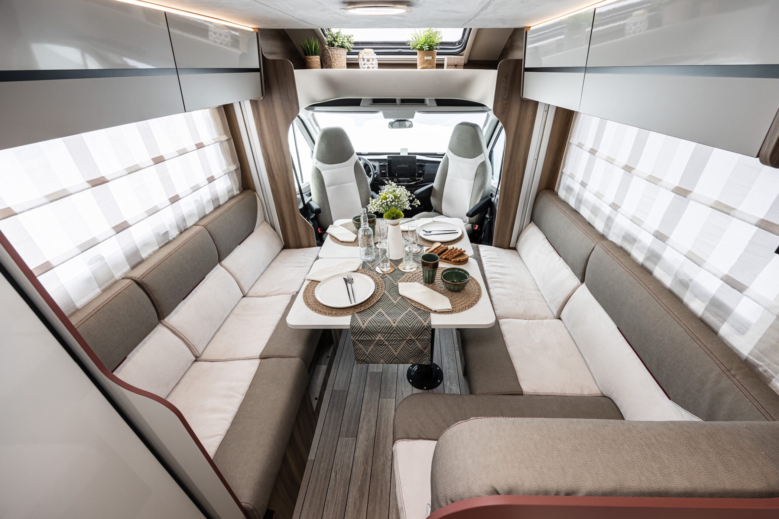Interiört noteras generösa sällskapsytor, nytt kökskoncept och rymligt badrum. Vid långbäddarna ses ett ovanligt stort panoramafönster som bidrar till rymdkänslan. Smidiga modellen Neo kommer i ett uppdaterat utförande med gul karosstrajpning, nya materialval och smarta detaljer som justerbart, infällbart handfat och toalett. Serien F-Line Together blir jubileumsmodell och ska bara säljas under en begränsad period. Modellen kombinerar integrerad konstruktion med taksäng fram och U-sittgrupp bak.
