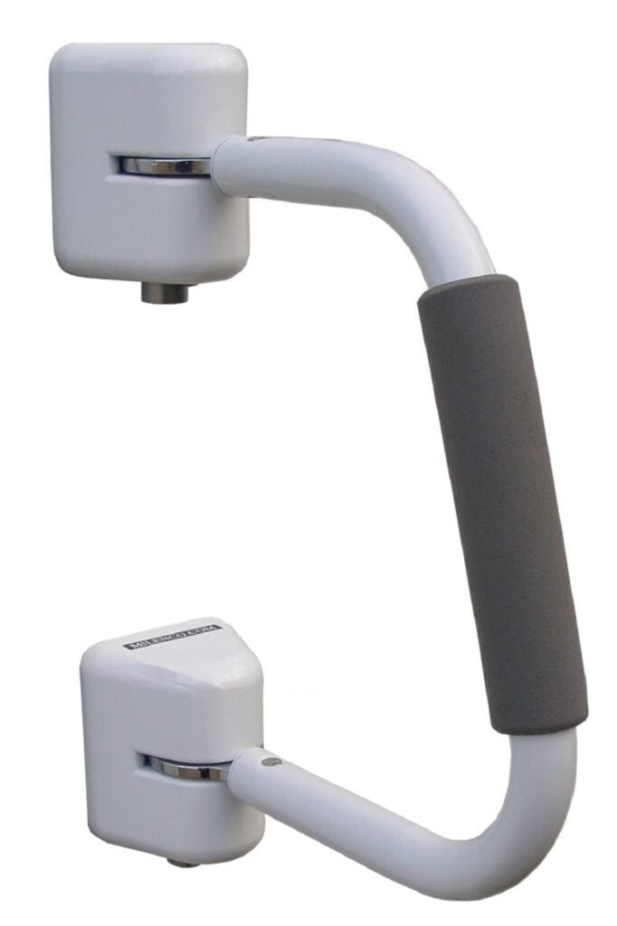 Security 46 för husvagn och husbil. Fungerar som instegshandtag samtidigt som du höjer inbrottssäkerheten. När du lämnar fordonet fälls bygeln över dörren och låses i stängt läge. Kan även spärras i öppet läge om du inte vill använda den som handtag. Passar på såväl höger- som vänsterhängda dörrar. Höjd 46 cm. Levereras komplett med skruv, beslag och lås med två nycklar. Tillverkat av 30 mm eloxerat aluminiumrör.