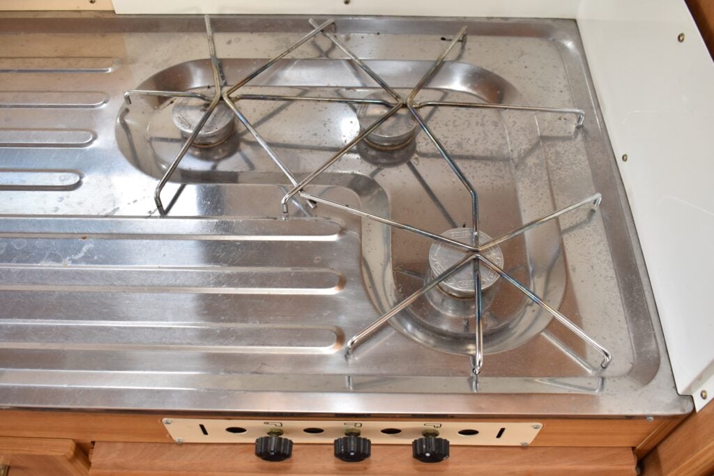 Apropå köket så har det sin plats precis innanför entrédörren. Det är utrustat med trelågig gasolspis och en hyfsat stor diskbänk samt utdragbar skärbräda i trä. Förvaringen är ganska väl tilltagen, inte minst tack vare att kylskåpet är placerat på motsatta sidan av mittgången. Förvaringsmöjligheterna är för övrigt generösa i hela vagnen. Här finns gott om överskåp och dessutom två rejäla höga skåp/garderober.