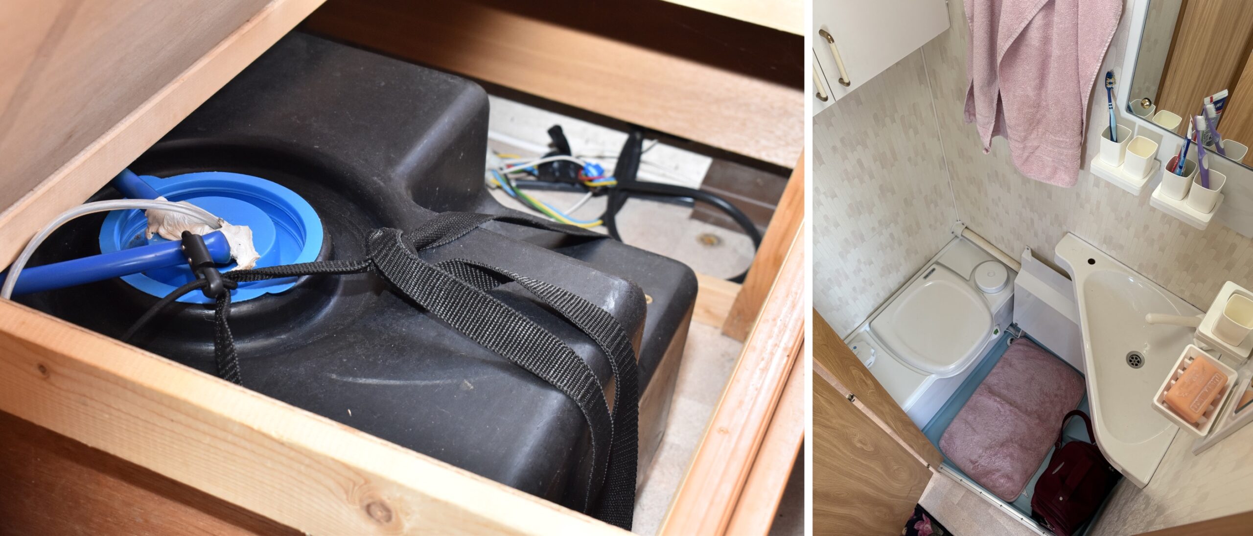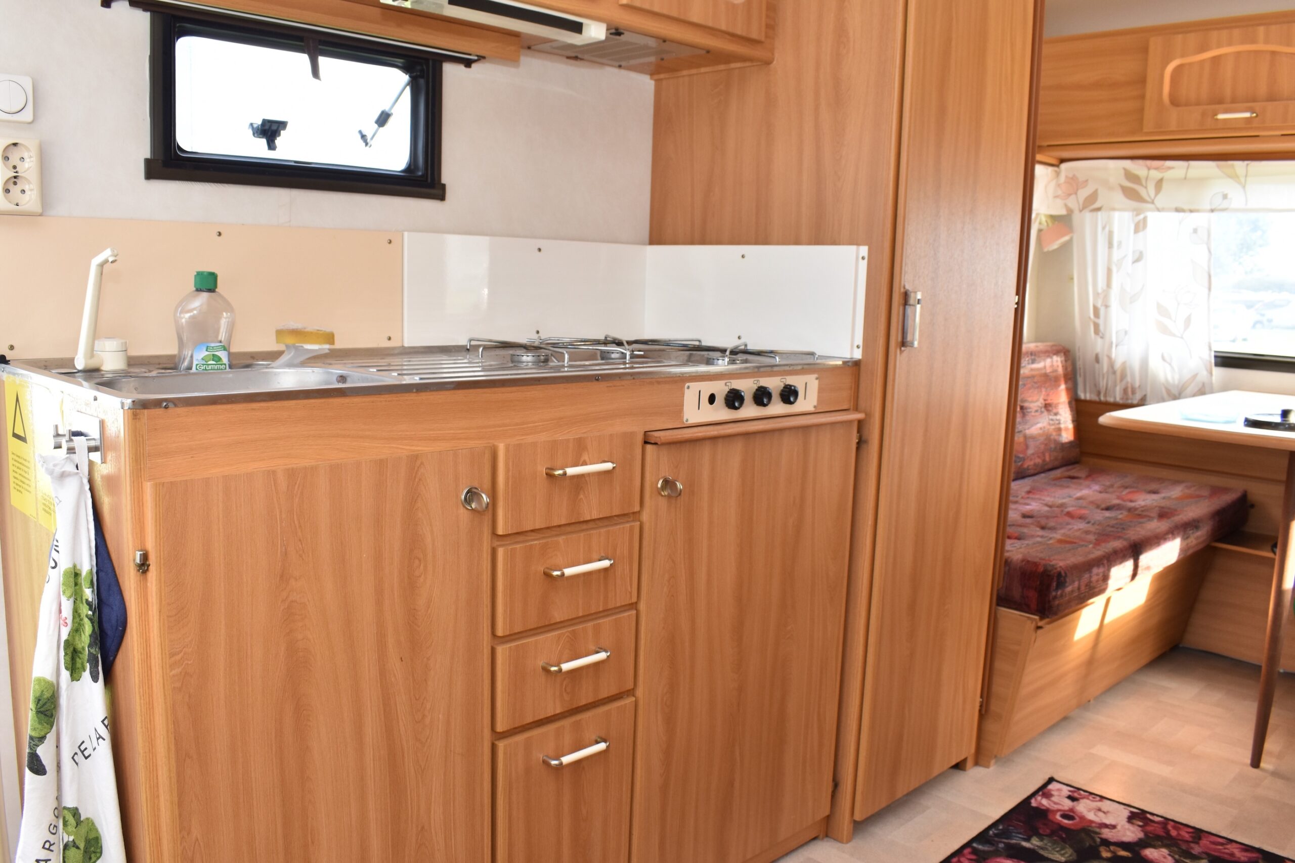 Apropå köket så har det sin plats precis innanför entrédörren. Det är utrustat med trelågig gasolspis och en hyfsat stor diskbänk samt utdragbar skärbräda i trä. Förvaringen är ganska väl tilltagen, inte minst tack vare att kylskåpet är placerat på motsatta sidan av mittgången. Förvaringsmöjligheterna är för övrigt generösa i hela vagnen. Här finns gott om överskåp och dessutom två rejäla höga skåp/garderober.