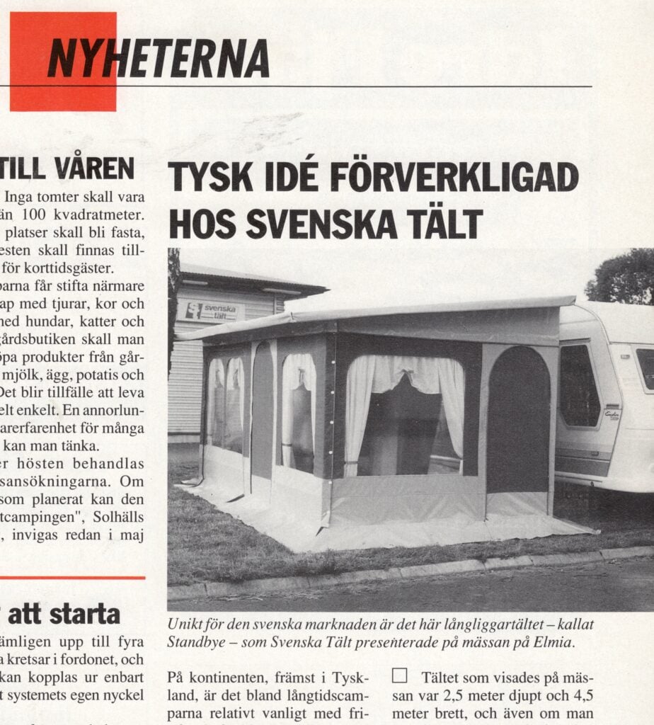 Det var på Elmiamässan 1993 som Svenska Tält i Dorotea presenterade sin (i dubbel bemärkelse) stora nyhet: ett fristående förtält som kunde lämnas kvar även om man reste i väg med sin husvagn.