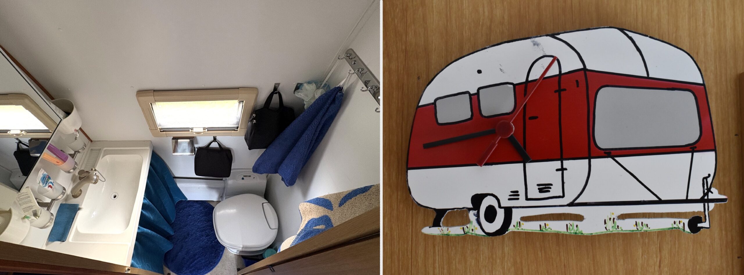 Mittemot köket finns hygienutrymmet och ett rejält högskåp, inbäddat i ett smakfullt träparti och en stor spegel. Här finns även en utdragbar låda som innehåller en papperskorg. Mycket snyggt och praktiskt! Vagnen värms upp av en Aldepanna, med manöverpanel precis innanför entrédörren.
