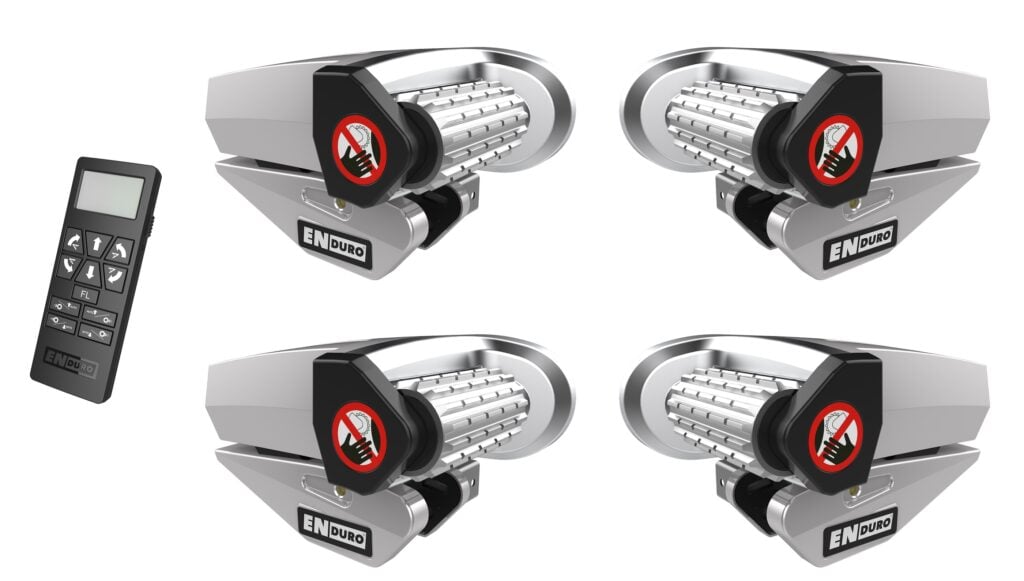 Manövreringssystem EM 515FL 4WD (efterföljare till EM 505FL). Utrustad med nya specifikationer: har större drivrullar (70 mm) vilket skapar ökat grepp/däckkontakt. Med en husvagn (max 3 500 kg) kan du köra upp för backar med 18 procents lutning. Produkten har ett stänk- och korrosionsbeständigt tätat hus. Fjärrkontroll: start/stopp-teknik som kopplar drivrullarna på/av däcket. Kontrollboxen och fjärrkontrollen visar felmeddelanden via lysdioder.