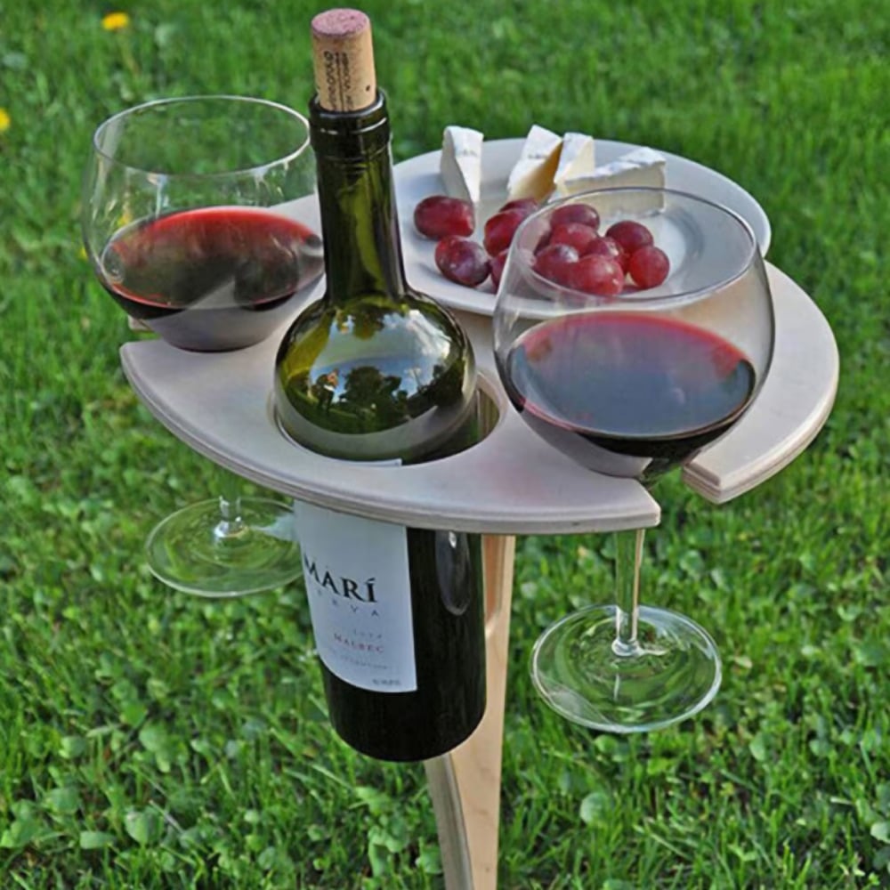 Vad sägs om en romantisk picknick mellan brassestolarna, utanför husvagnen/husbilen. Kör ned den spetsiga nederdelen i gräsmattan. Sedan är det bara att duka upp med ost, vin och kex. Tillverkat av hållbart trä. Väger endast 310 g. Storlek på uppläggningsskivan: 34 x 24 cm.