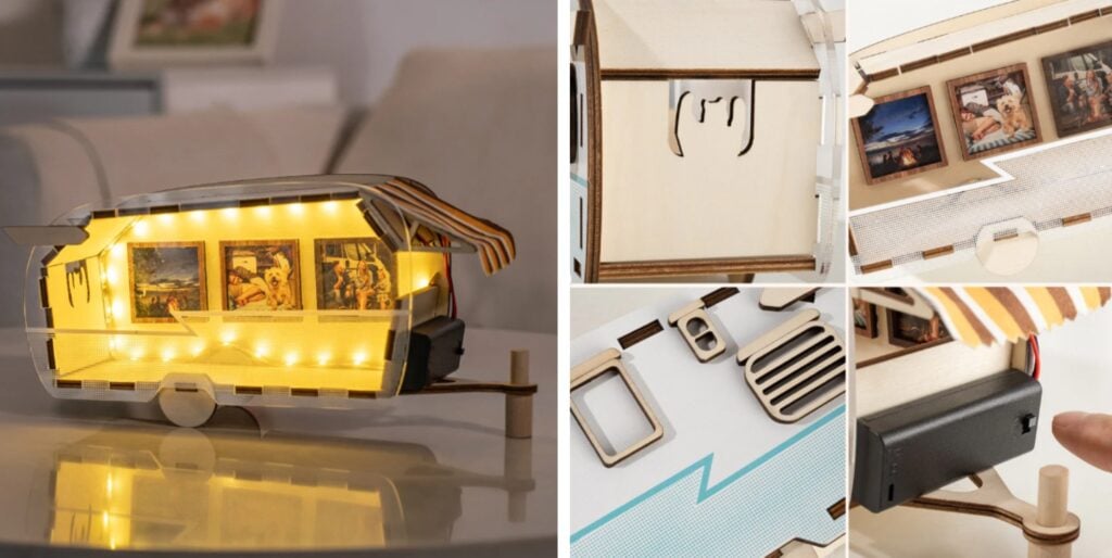 Trevlig, udda, unik ”fotoram” i trä, formad som en husvagn. En produkt som blir minst sagt personlig med tre egna foton. Passar även utmärkt som en gå-bort-present. Har LED-ljus och öppen front.