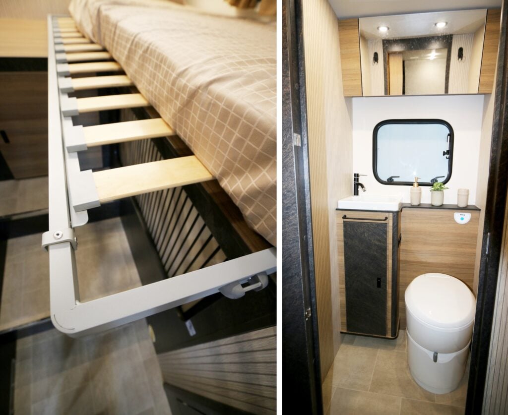 Flyttar bak till avdelningen för nattbruk som har en trevlig touch. Här har Rimor en egen lösning på bäddbreddningen och inte den konventionella med utdragbar ”dragspelsfunktion” mellan sängarna. Nej, här drar du ”breddandet” sidledes utifrån ena sängen (se foto). Stuvutrymme finns under dess fotände. Märkligt nog hittar vi ingen garderobsstång.