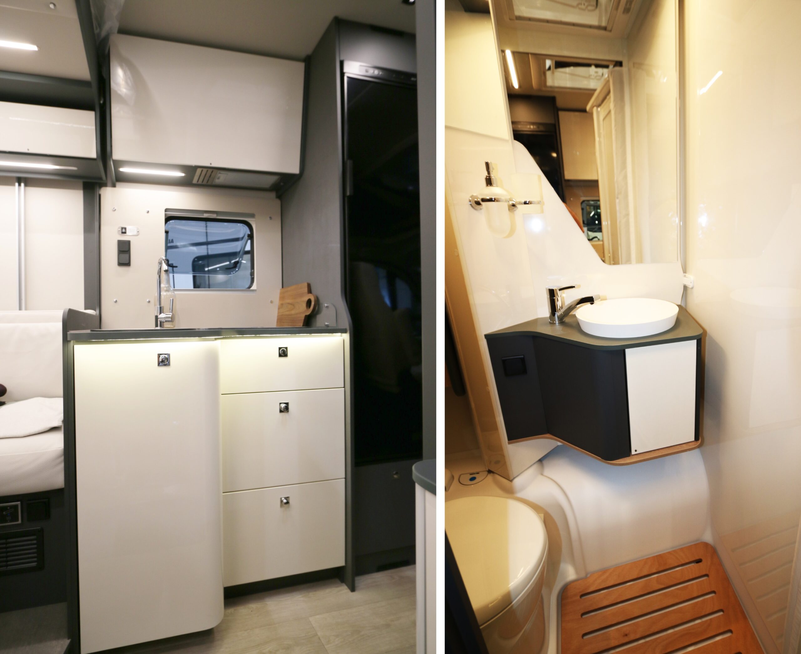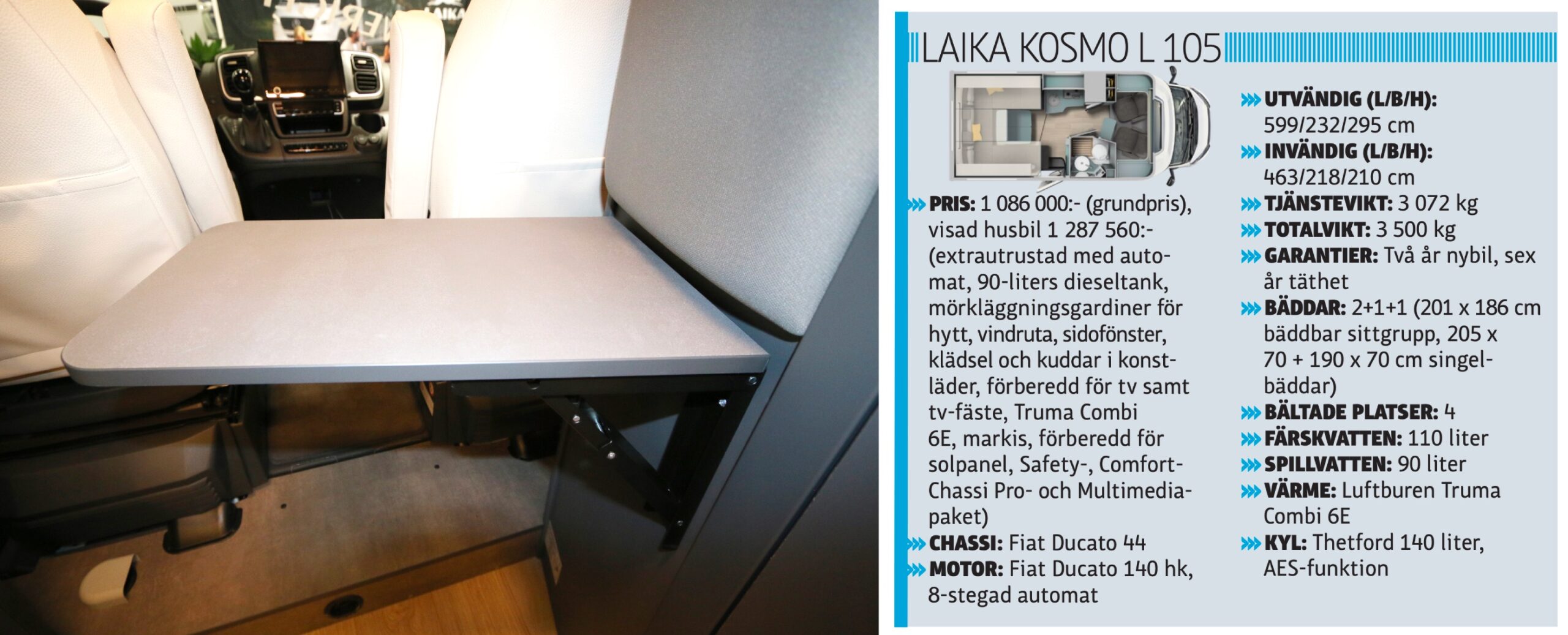 Två takfönster förser husbilen med välbehövligt ljus. I hygienutrymmet gäller svängbar handfatsvägg där du som resenär kan trolla fram en duschkabin på en sekund eller två. Allra närmast baksidan på hyttstolarna finns en 19 centimeter bred (ursäkta, smal) garderob och mitt emot den ett klaffbord för antingen fika eller kanske mailkoll i datorn.