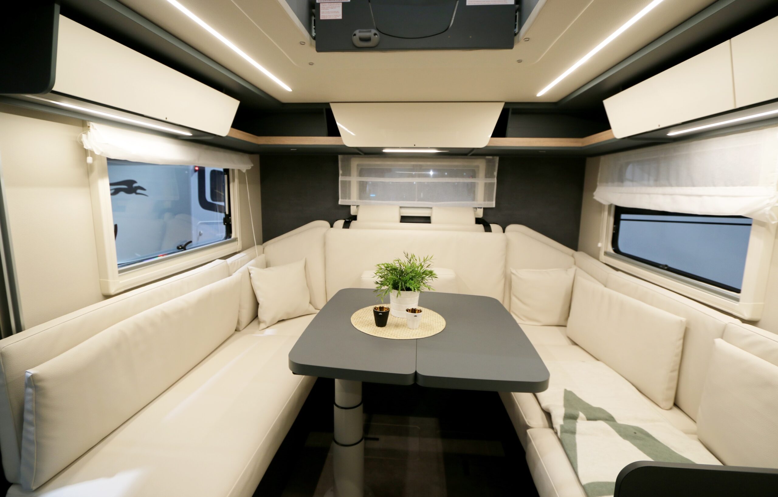 Naturligtvis är det nedfällbar taksäng som gäller. Den styrs elektriskt och består av dubbla singelbäddar inkluderat bäddbreddningsfunktion. Ja, ni läste rätt. Den horisontella positionen under nattetid sker alltså på längden och inte på tvären. Därmed elimineras momentet klättra-över-sin-partner-mitt-i-natten. En ”liten detalj” som visade sig vara mycket uppskattad av besökarna.