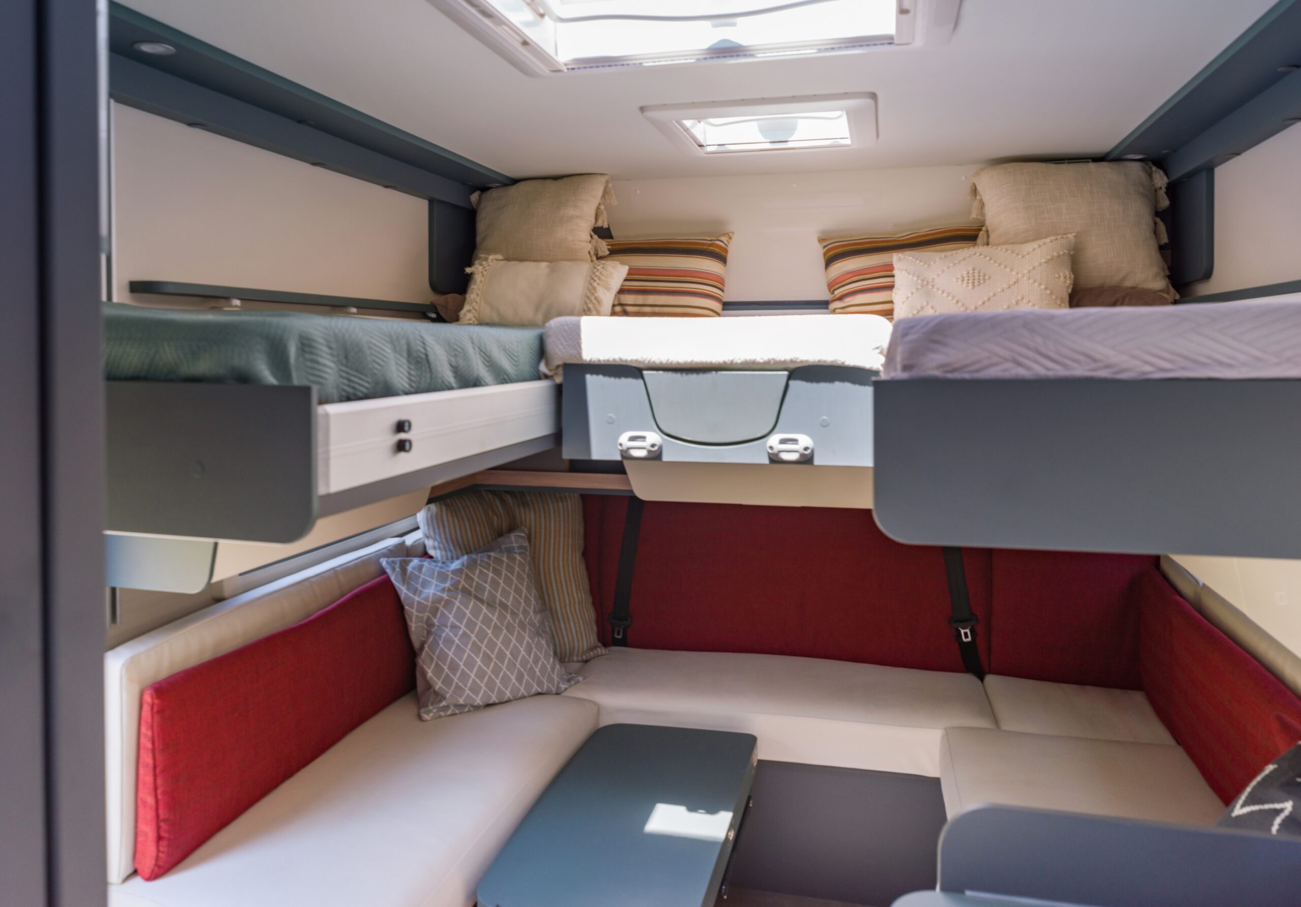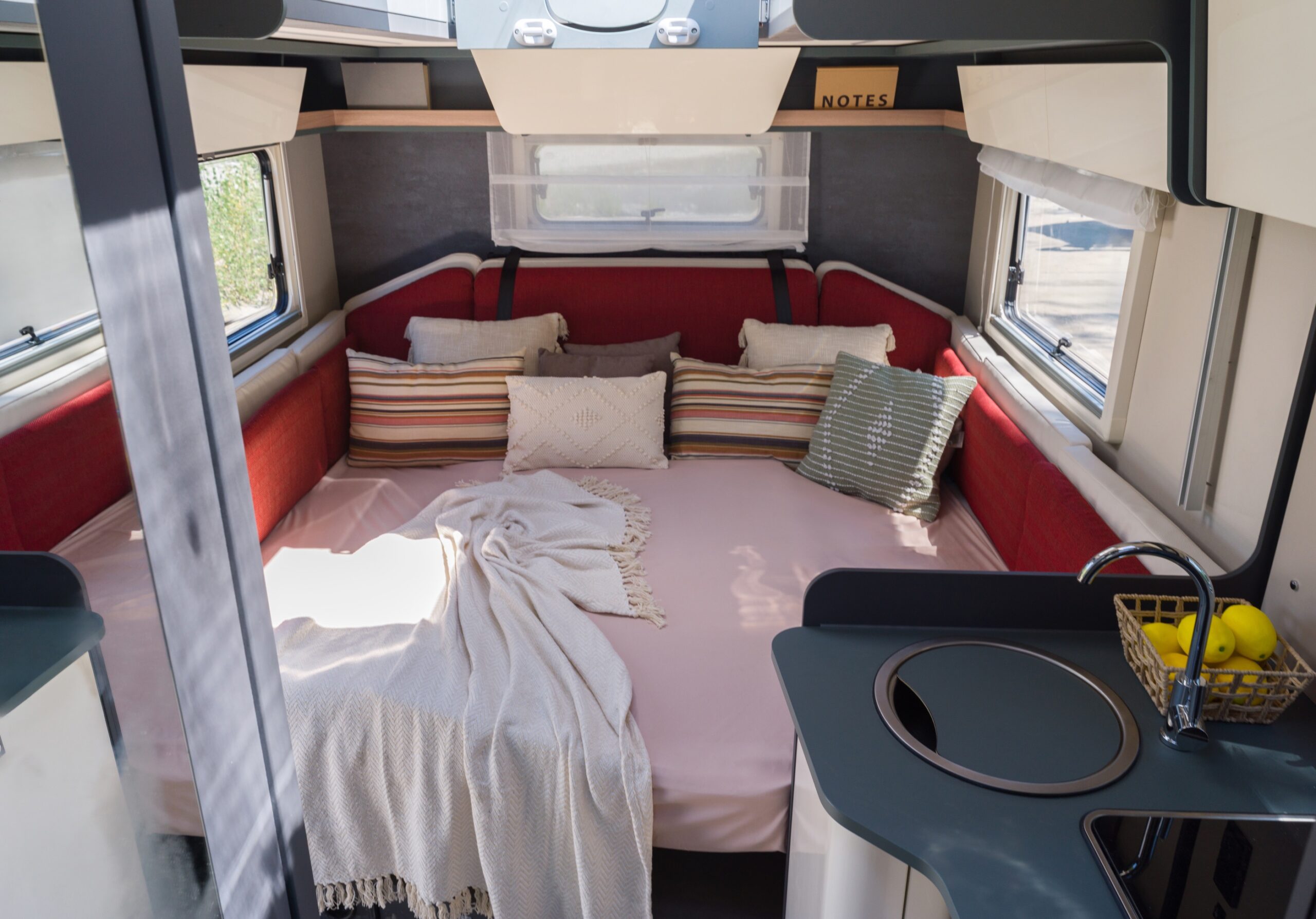 Du kan till och med blanda hej vilt om så önskas och låta de korta kuddarna vara röda och de långa blåa, för att nämna ett exempel. Den väldiga soffan är naturligtvis bäddbar, vilket innebär fyra sovplatser i en minimal halvintegrerad husbil – wow!