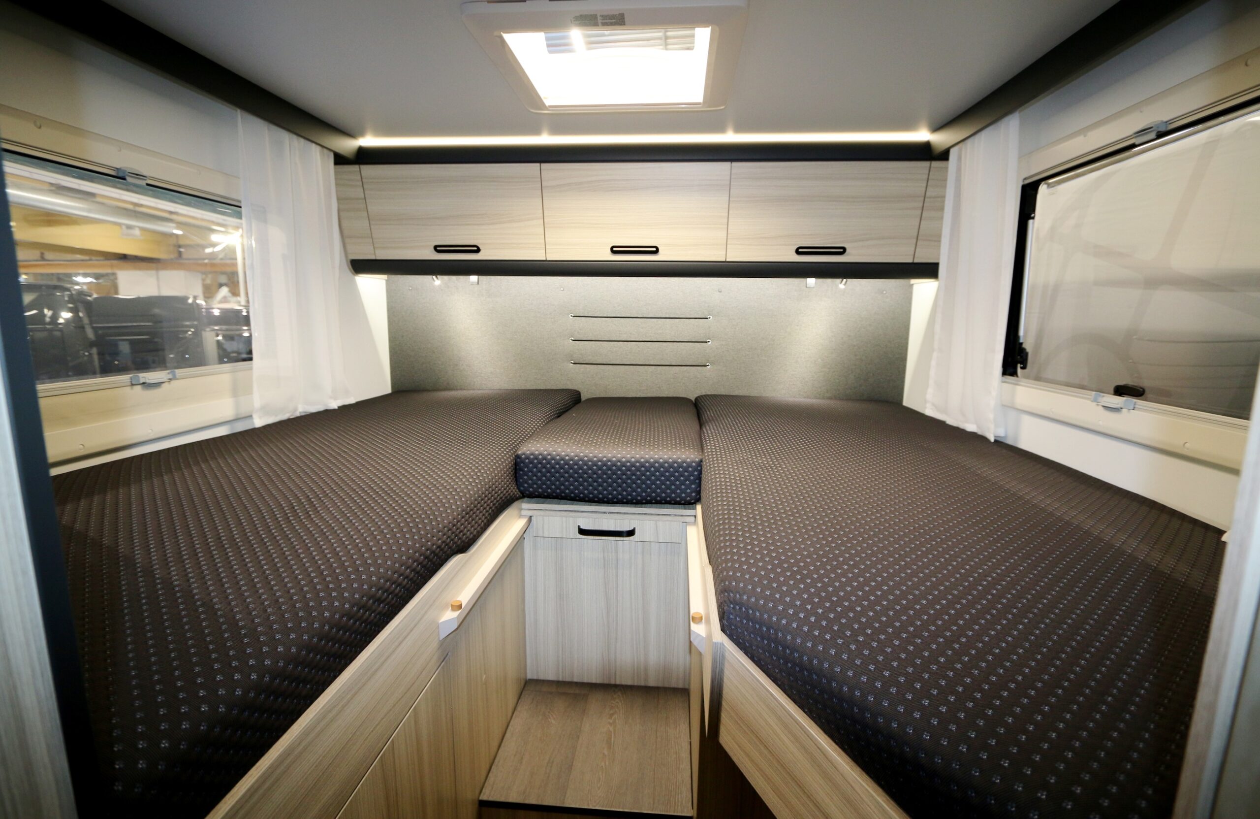 När vi ändå avslutningsvis är inne och snuddar vid förvaring kan vi nämna att det finns åtta överskåp (försedda med gasdämpare) samt lite extra utrymme i trappan till sängarna. Vid bäddarna finns läslampor och USB-laddningsuttag som alla löper på skena.