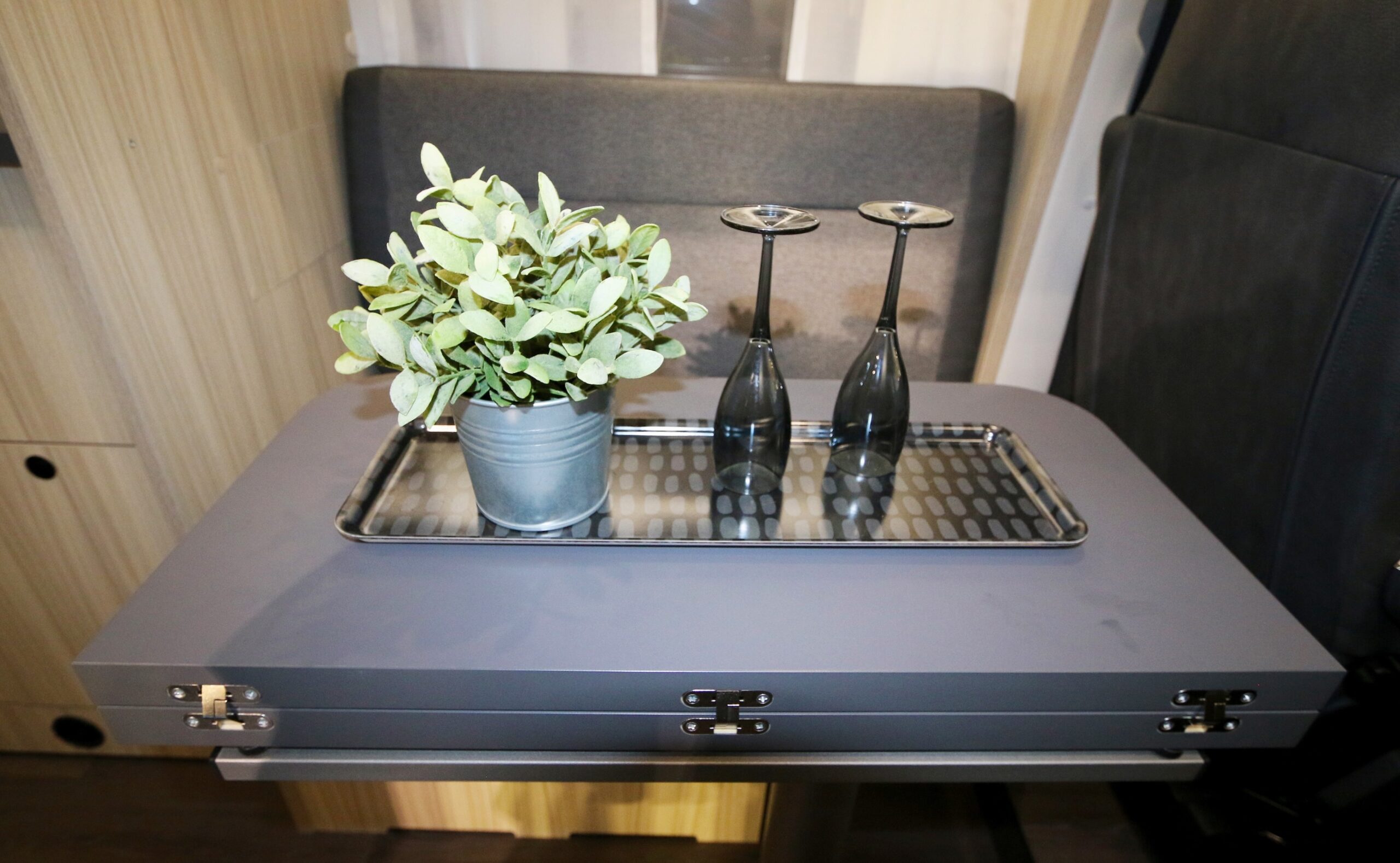 Bordsskivan kan vikas så att passage till/från hytt förenklas. Invändigt gäller ljus träfaner på luckor och möbelmoduler, ett mörkt ”trägolv” samt svarta detaljer i form av blandare, dörrhandtag och överskåpsbeslag. Köket har två brännare, vilket räcker gott och väl, och fyra djupa förvaringslådor. Hade dock önskat en besticklåda, men det får vi uppenbarligen kirra på egen hand.