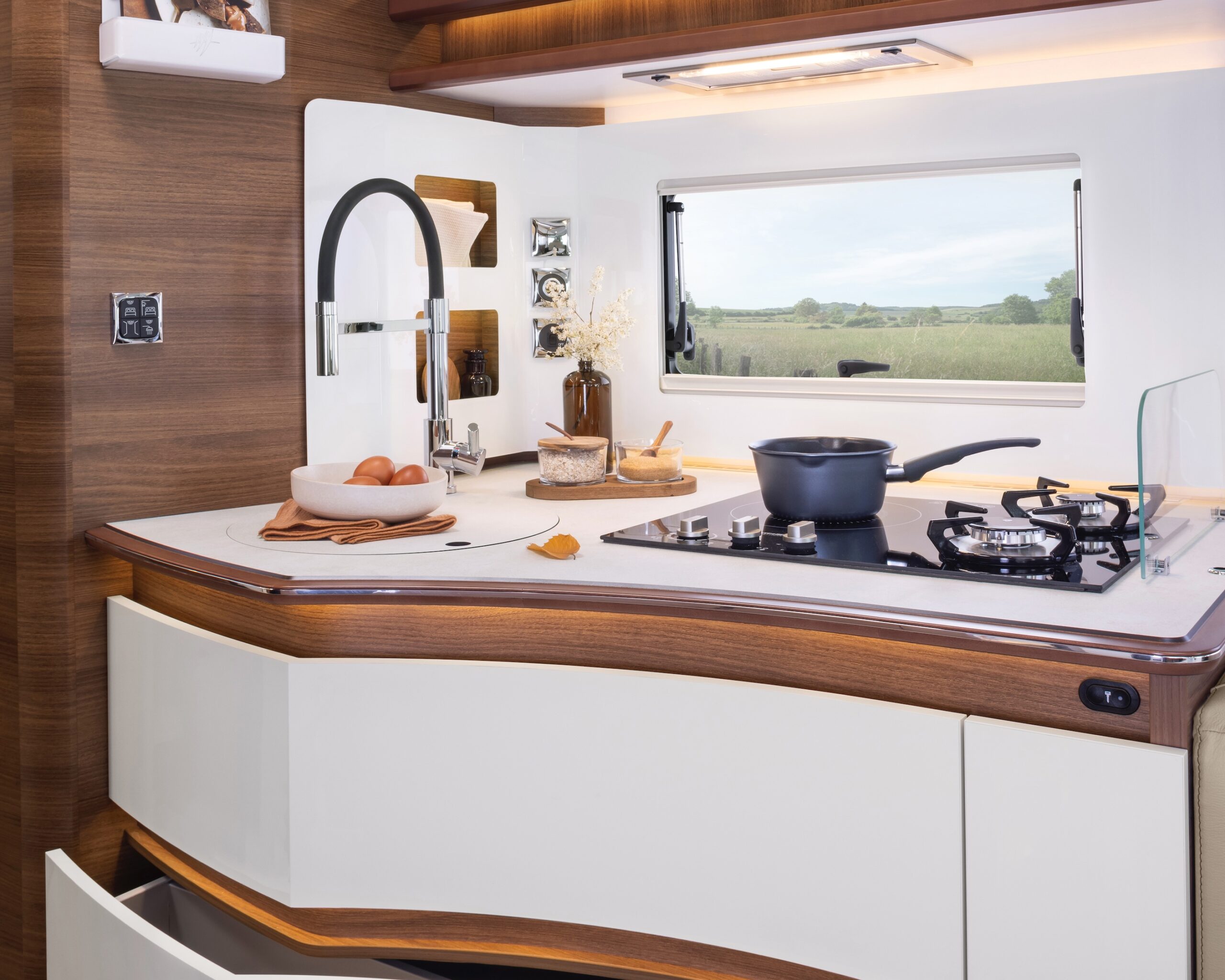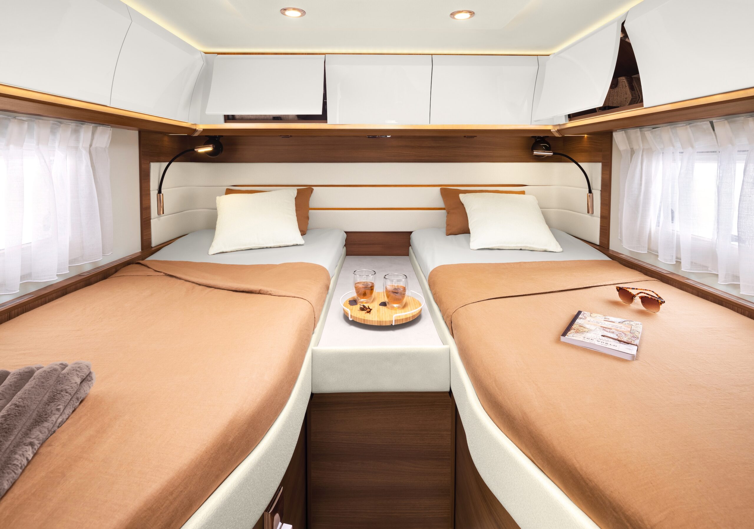 två avdelningar är separerade från varandra) och att singelbäddarna har bäddbreddningsfunktion. Att nå packningen under sängarna gör du dessutom plättlätt via ett knapptryck. Garaget är en fröjd, i varje fall för dem som vill ha med sig halva bohaget när det vankas husbilssemester.