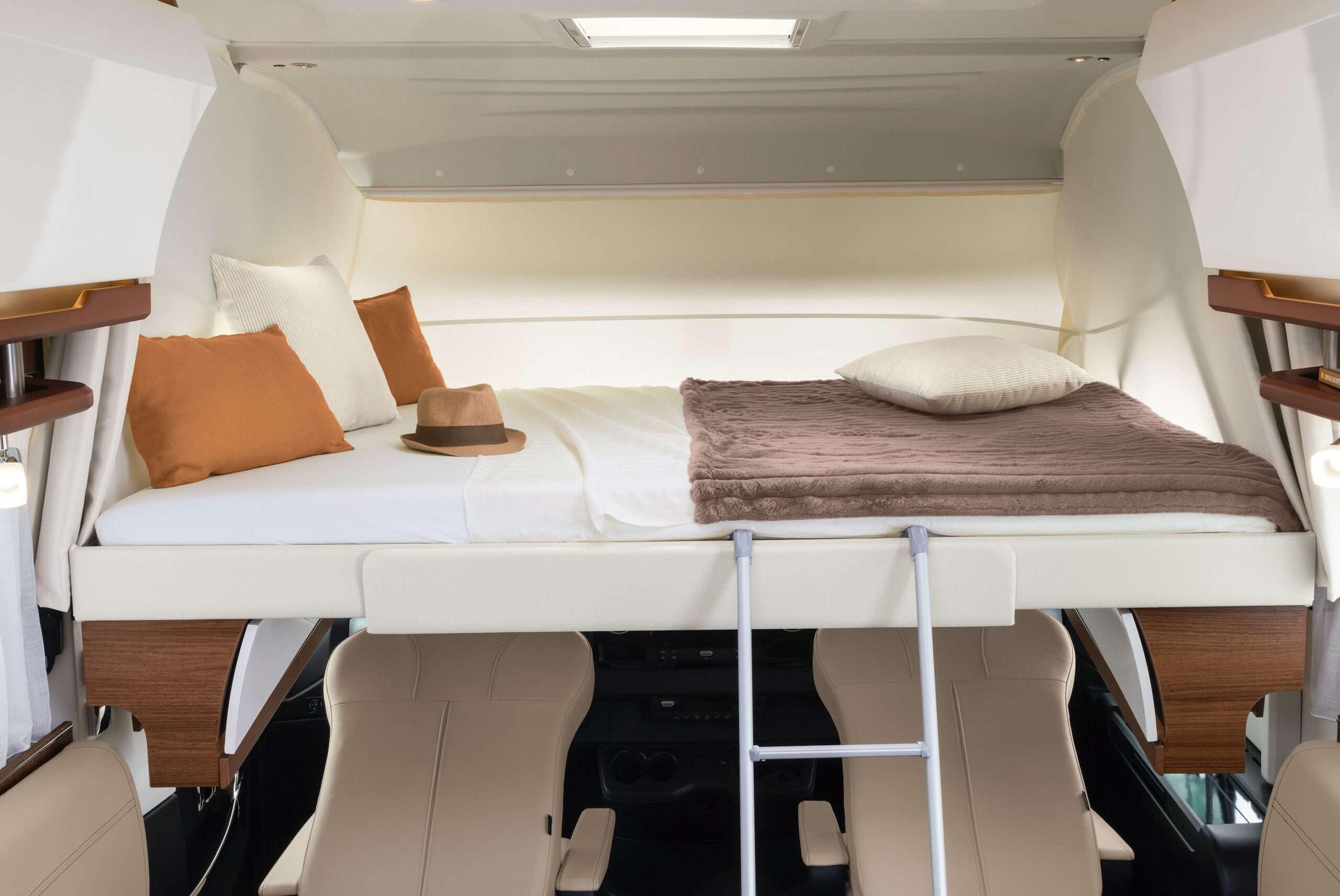 När vi parkerar för att utföra husesyn noterar vi en nedfällbar taksäng ovanför hytten. Den är så fint integrerad med övrig inredning att vi först inte ens såg att den fanns där.