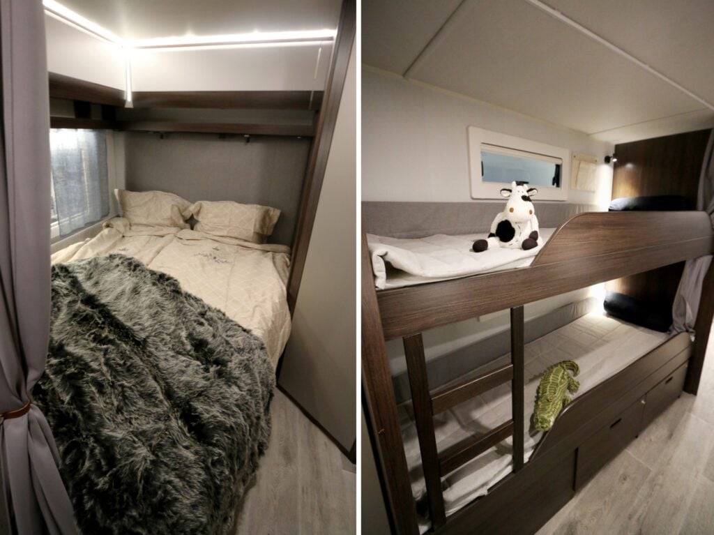 Vi nämnde tidigare att kidsen har egen dinett och givetvis även en våningssäng i vagnens centrala parti. Bäddplatserna är försedda med varsitt fönster, tygficka och läslampa. Dessutom noteras två utdragbara stuvutrymmen under den nedersta sängen samt att det även ryms en hel del packning under dinettens båda soffdynor. Kommer ungarna trivas tro? Skoja inte!