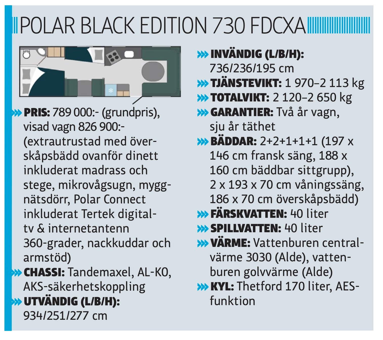 Interiört gäller Bluelines färgsättning. Serien tillverkas i fyra olika versioner: 590 FWA (fransk säng), 620 BSA (singelbäddar), 650 BQDA (tvärställd dubbelsäng) och barnkammarvagnen 730 FDCXA som vi nu ska syna i sömmarna.