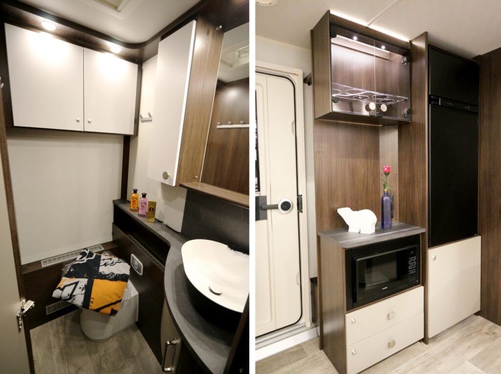 Köksavdelningen är ett mäktigt kapitel i sig. Vad sägs om fyra brännare, grill, ugn, mikrovågsugn och ett kylskåp på 170 liter (frysen är på 31 liter). Dessutom mängder av förvaringsutrymmen. Halleluja! De två sistnämnda komponenterna är placerade mitt emot köket där även vitrinskåp och plats för tv bockas av. Sedan kan man tycka lite si och så om mikrons placering (nästan på golvnivå), i alla fall om ni har småbarn.