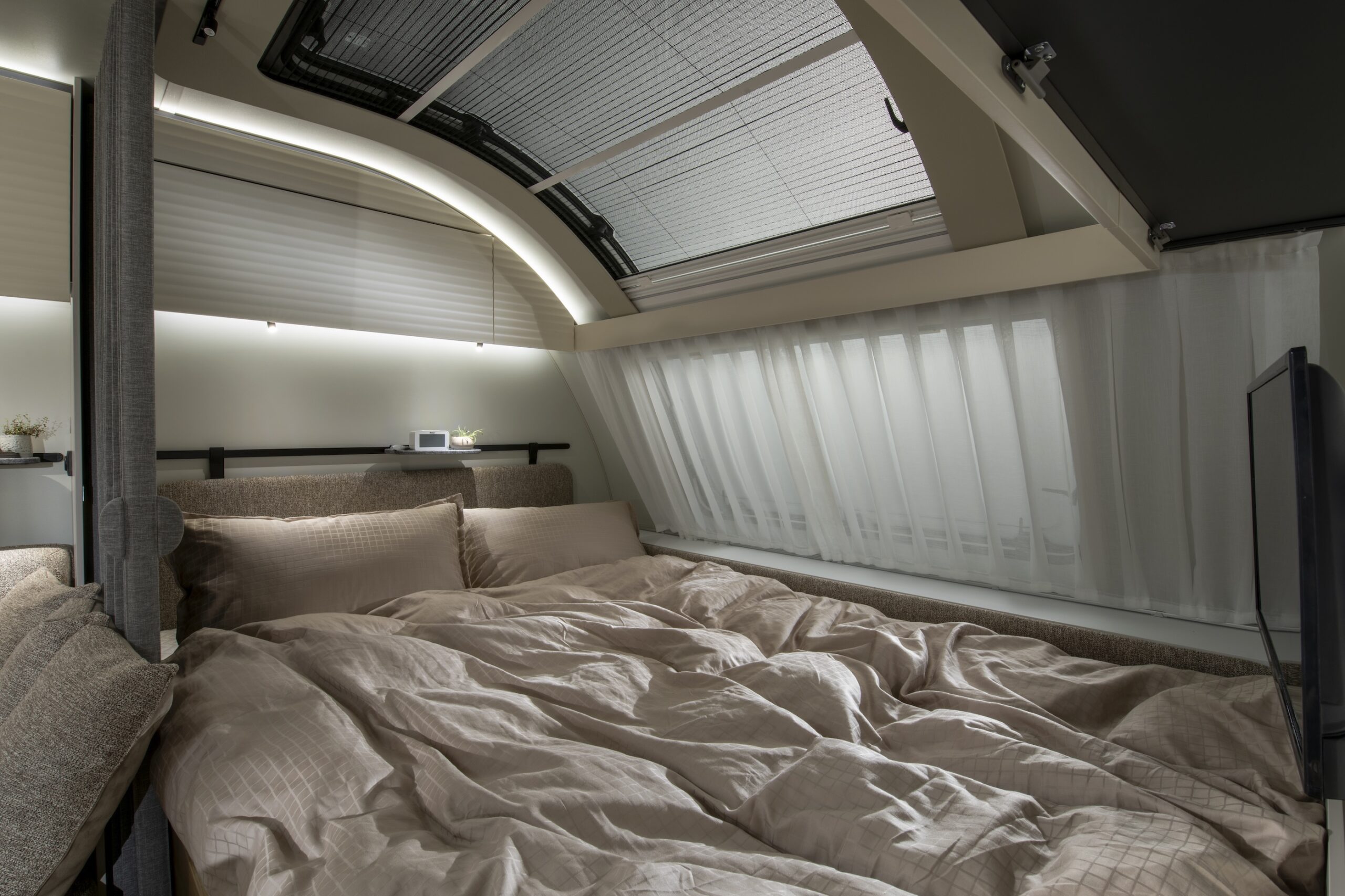 Föräldrarnas säng i vagnens frontparti har utrustats med justerbar huvudända samt en högkvalitativ EvoPore-madrass. I sängramen har det även bakats in skoförvaring (nära entrén). Smart!