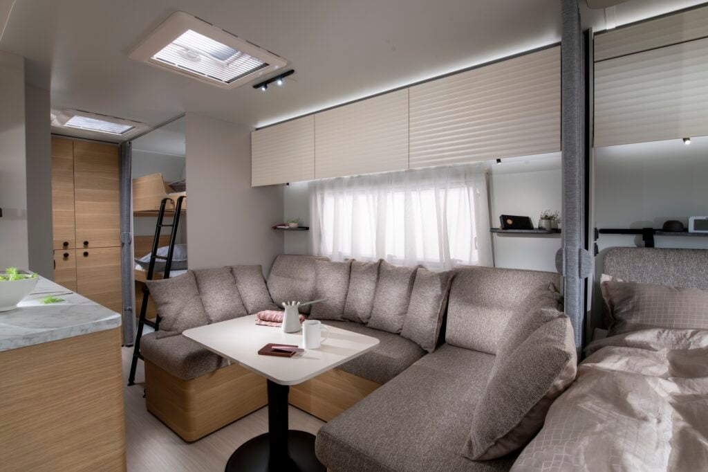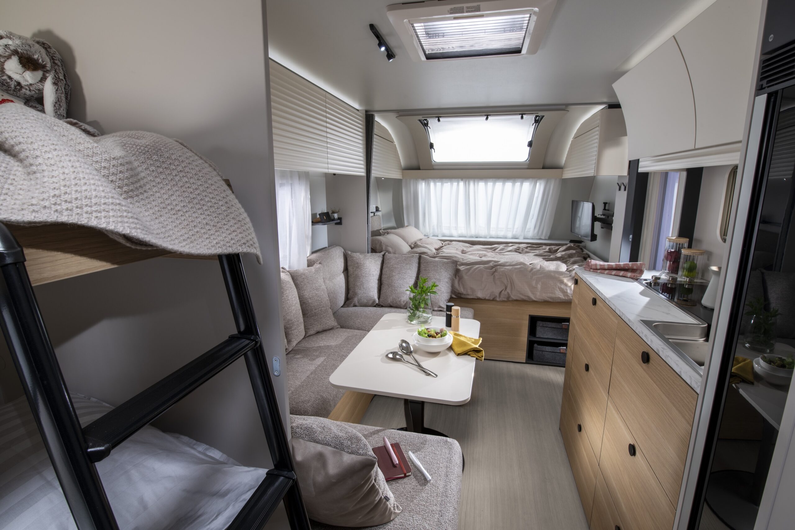 Sovplatser för sex personer är sannerligen inte fy skam och det är tillvalet – våningssäng med tre bäddar – som utökar antalet från fem till sex. I den nämnda sängmodulen är det max 70 kg som gäller i de två översta (den nedersta är på golvplan och är något kortare).