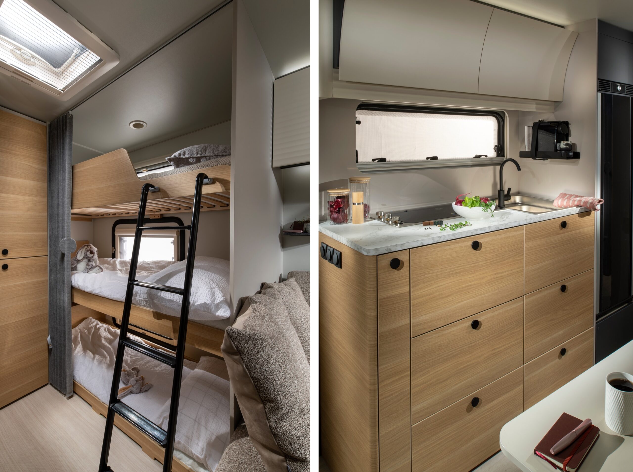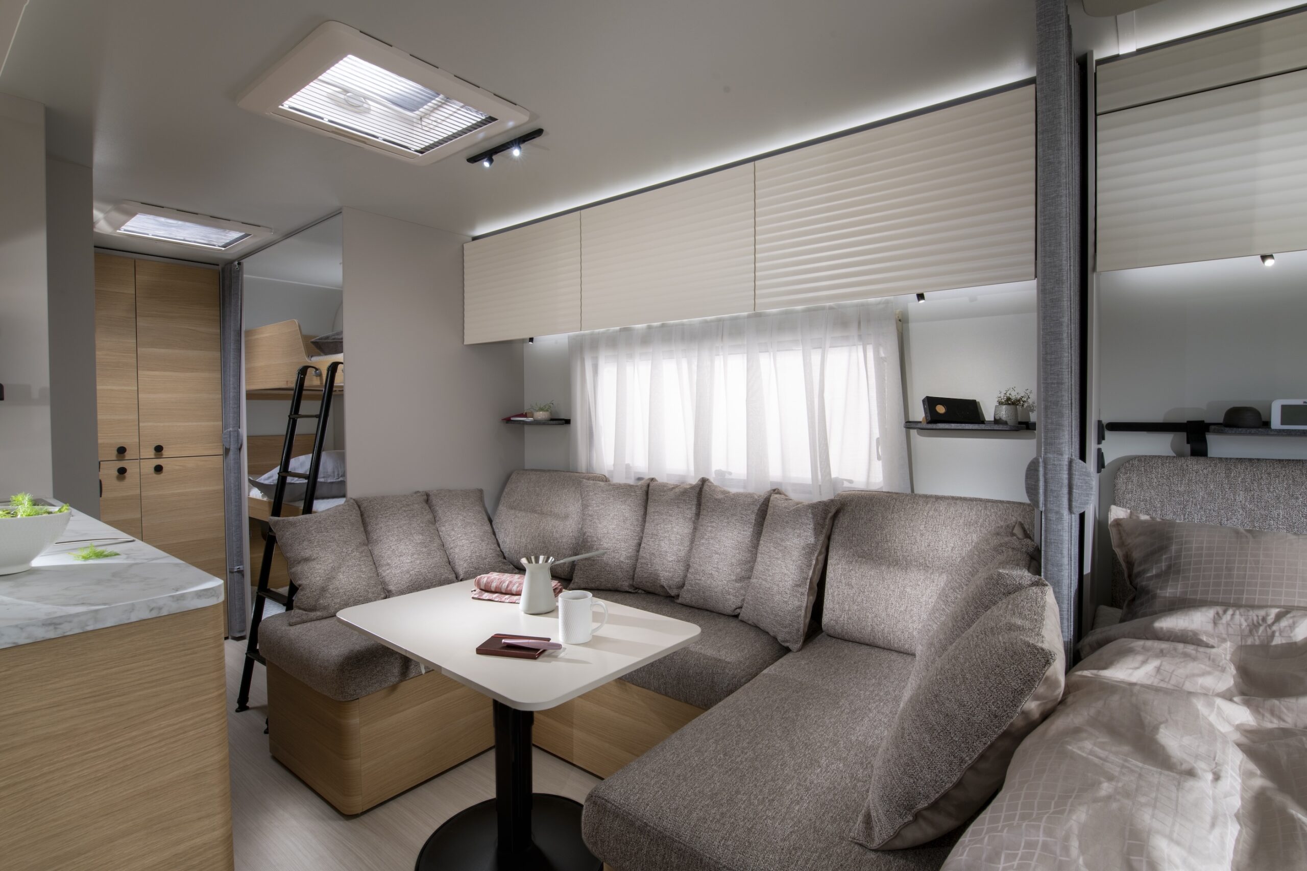 Vidare noteras svarta detaljer (blandare/beslag), bänkskivor i marmorstil, annan sängram vid huvudändan, bättre hygienutrustning med bland annat Alde-Tower i duschen, kompressorkylskåp, ny form av tilltalande kuddlösning i sittgruppen samt annat träslag för att nämna ett axplock.