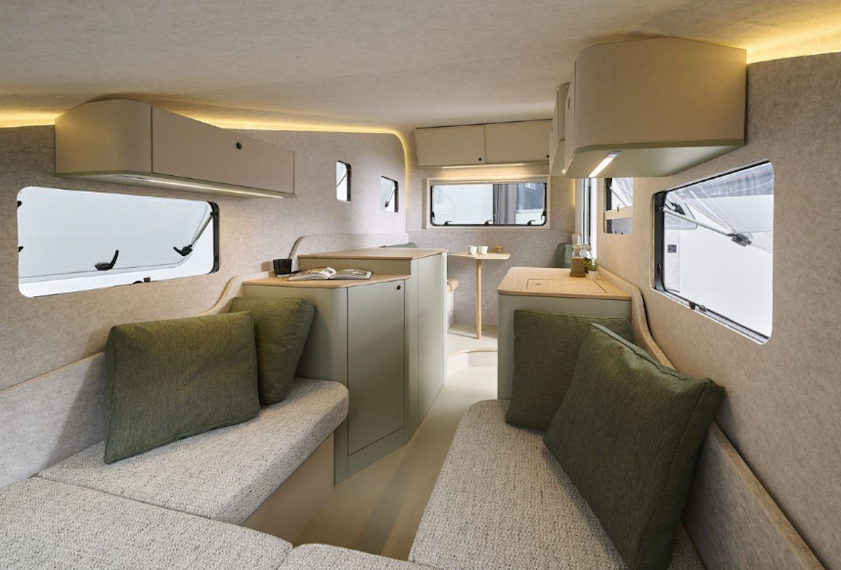 För att hålla nere släpvagnens vikt förlitar de sig på en karosskonstruktion av aluminium/komposit och isolering gjord av återvunna PET-plastflaskor. Resultatet är en 549 cm lång skapelse som endast väger 775 kg. Med andra ord: lätt nog att dra av en mängd olika elbilar och små förbränningsdrivna fordon.