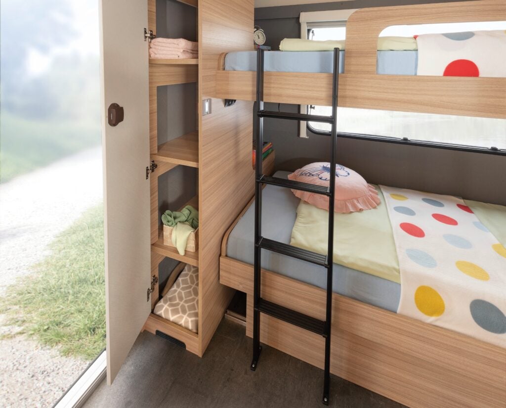 Bland utrustningen noteras stor förvaringslucka, bred entrédörr, varmvattenberedare och 137-literskylskåp med integrerad 15-liters frys. Interiört gäller vita möbelytor med varm träinredning samt klädsel i en vänlig, neutral grå färg. Snygga svarta accenter på handtag, köksinredning och våningssängsstege kompletterar det moderna utseendet.