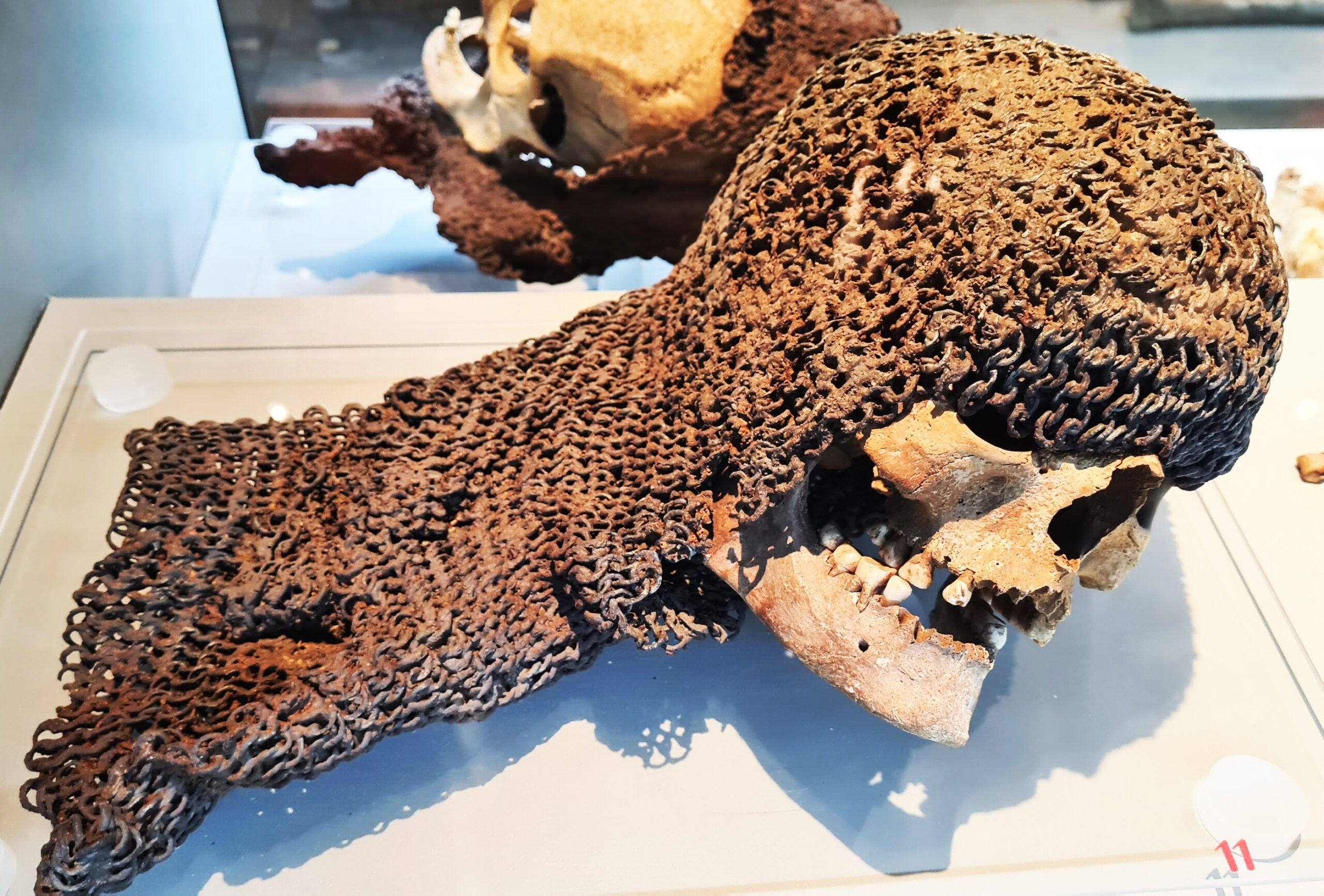 Vi tänker på all dem som stupade när vi ser den makabra döskallen med pilspetar i skallbenet och den fastrostade ringbrynjehuvan runt en annan benvit skalle. Dessa finns att se i montrar på Gotlands Museum (på tio i topplistan över Sveriges mest besökta museer). Men precis som andra sevärdheter i Visby är det behagligt glest med besökare denna lördag. Vi tar nästan två timmar på oss för att se allt, lära oss mer om de tropiska korallrev som efter miljontals år blev till Gotland.