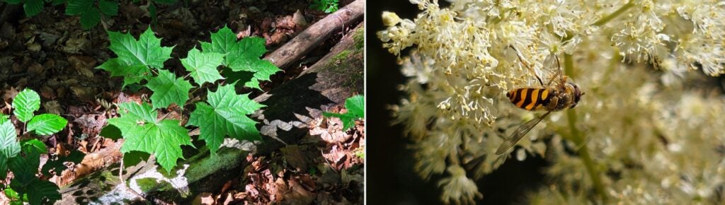Här finns två toppar till som bjuder på fina vyer, bland annat ner mot den härliga sandstranden. Efter ”toppbestigningen” tar vi branta, välbyggda trappor ner till den ibland småleriga Hälleviksslingan med en mosse och ett alkärr plus en av landets största avenbokskogar, vars blad skiljer sig mot den vanliga boken via sina sågtandade kanter. I juli är det dock torrt och fint på stigen.