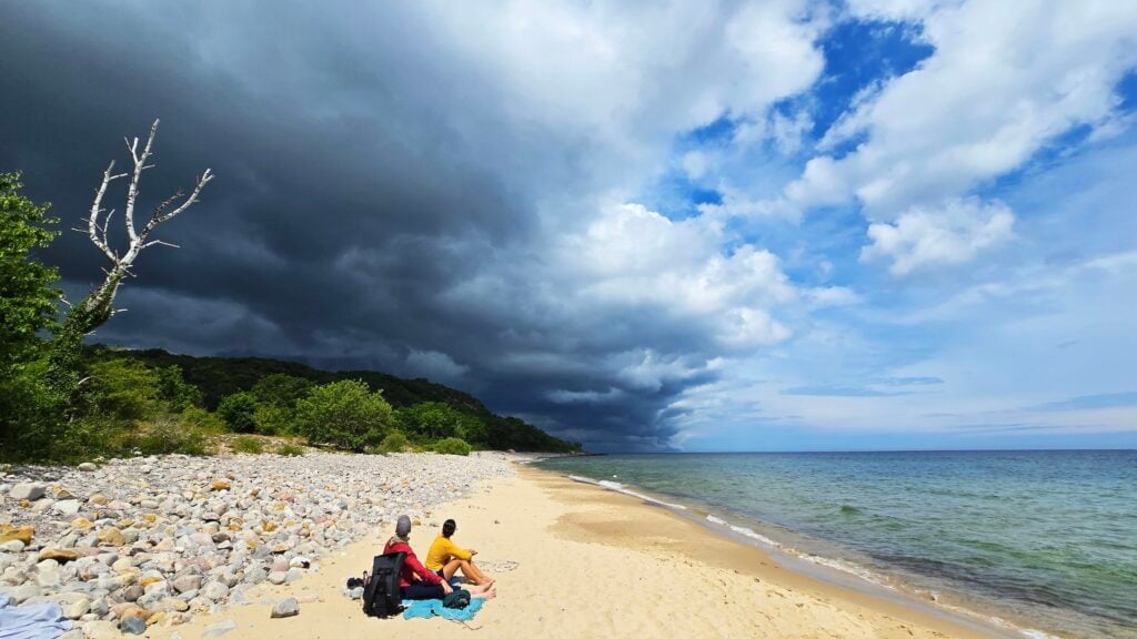 Vi soltorkar i den lena sanden medan ett stålblått regnmoln makar sig in över Stenshuvud aningen längre norrut än vår position. Det känns lite overklig att njuta i solskenet med mörka moln intill men till slut vinner molnen över solen och vi får traska upp till naturumet medan de första regnstänken känns i våra ansikten. Vi ”tar skydd” i kaffestugan Annorlunda, med – vi lovar – Skånes allra bästa surdegpizzor. Härligt stärkande efter ännu en nationalparksvandring.