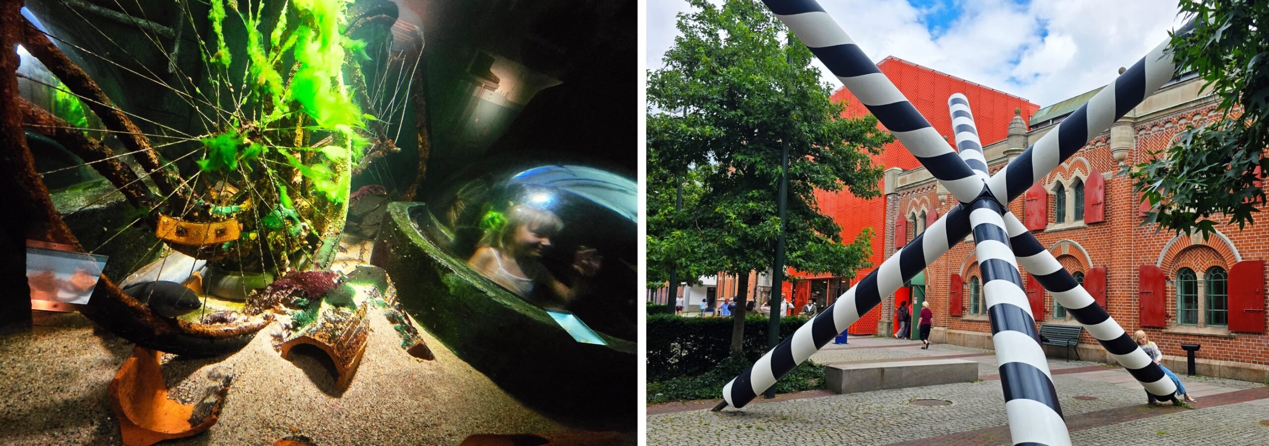 Vi börjar i källaren med det sevärda akvariet och terrariet och ser ålar i Öresundsmiljö, vackra giftiga drakfiskar och guldglittrande pirayor. Och vad sägs om illgröna ormar med bara en glasskiva mellan er och faran? Besöket blir mer än timslångt, så det fina slottshistoriska museet får vara denna gång, liksom Malmö konstmuseums utmärkta permanenta samling. Men den samiska konstnären Outi Pieskis stora separatutställning går bara inte att hoppa över, så där går en härlig timme till.