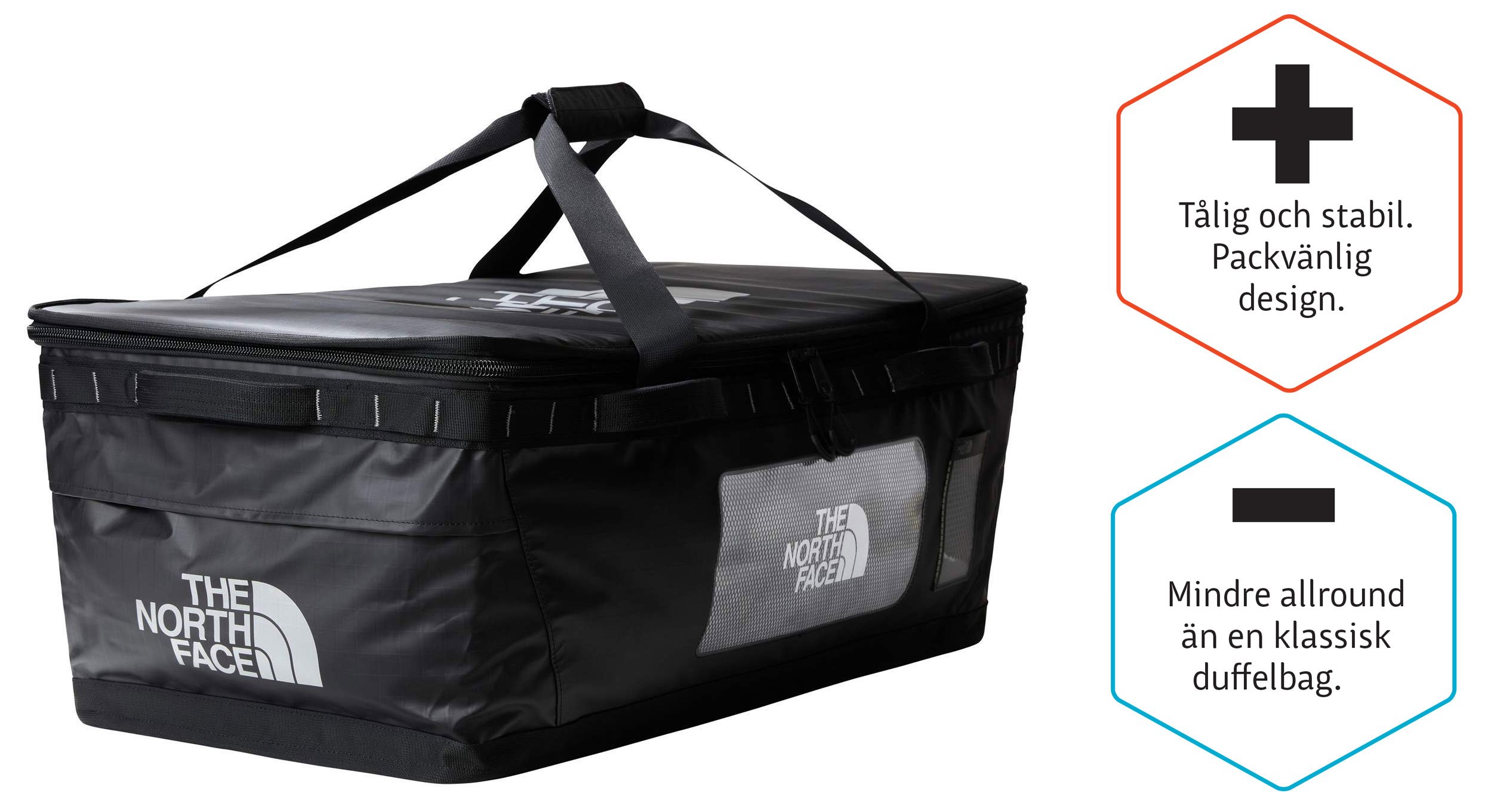 Packmässigt finns många bra detaljer, exempelvis stora meshfickor invändigt för prylar du vill komma åt ofta och smidigt, utan dessa blir det nog lätt rörigt i stora utrymmet. Den boxiga formen och stora öppningen inbjuder till att stapla campingkök, tallrikar, stolar och andra lägerprylar – där känns en mjuk duffelbag något mindre lämplig. Vi uppskattar också att Base Camp Gear Box kan plattas till helt när den inte används – skönt att slippa det irriterande ihopknöglandet som man tvingas till med mjukare duffelbags.