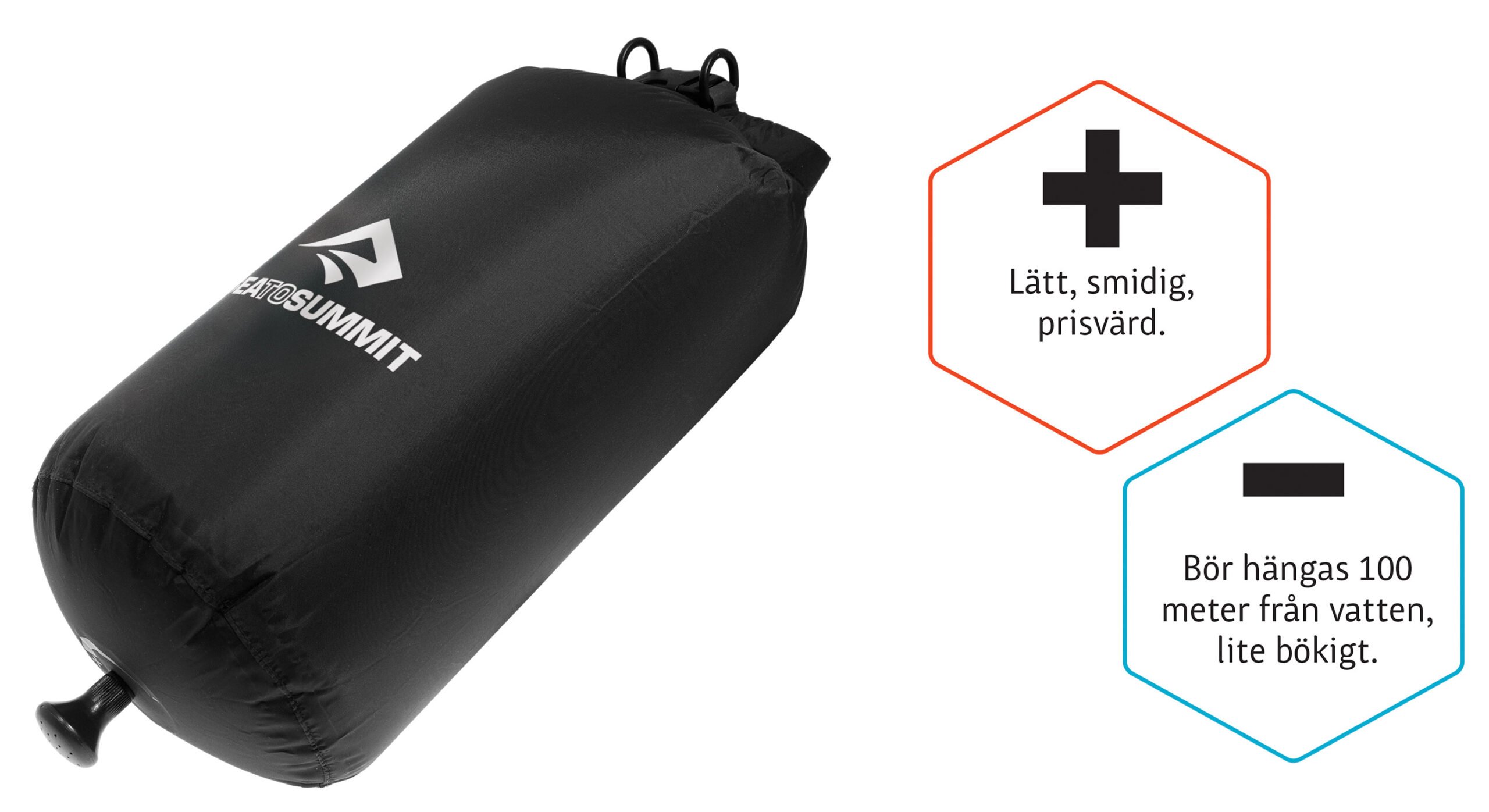 Vår första tanke: varför behövs en portabel dusch på turen – det är ju härligare att bada om ett vattendrag ändå finns? Men efter lite eftertanke och testande har uppfattningen justerats. Det är ju faktiskt inte alltid som vattendraget är särskilt badvänligt, och då vinner duschen. Men mest användbar är den här duschen som station för handtvätt, vilket är toppen när man slagit läger och ska elda och laga mycket mat. Eller om man har många små smutsiga barnhänder (och fötter!) att tvätta.
