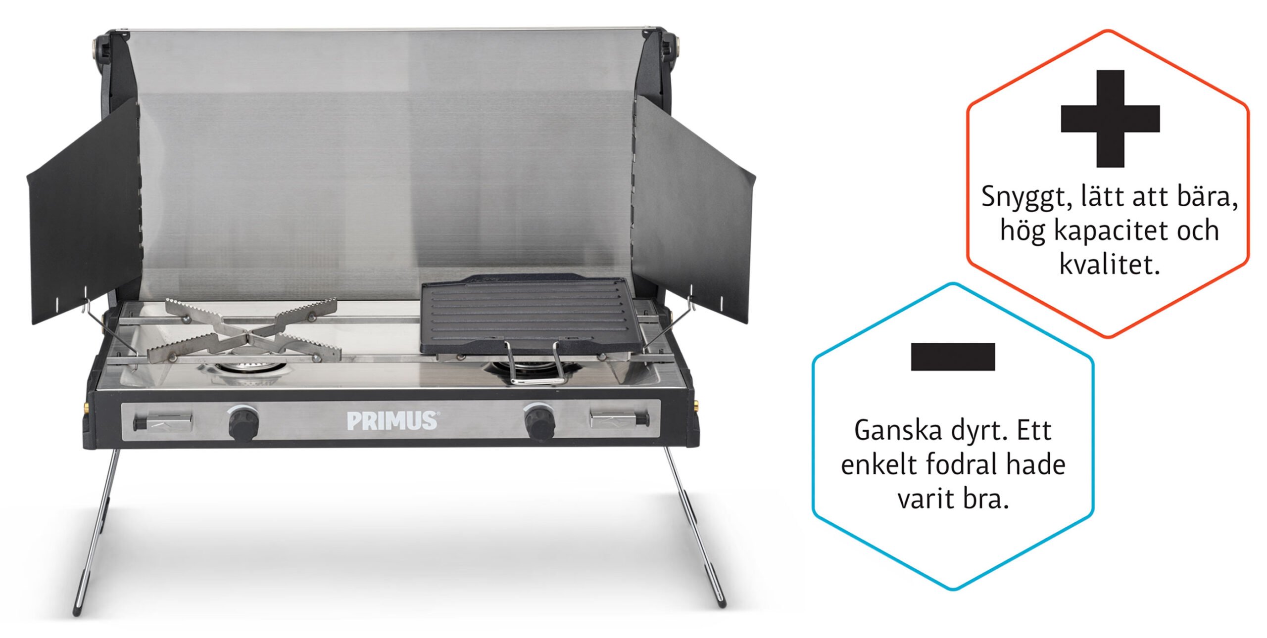 Tupike Stove har två brännare som tänds med integrerad piezo-tändare. Benen är utfällbara och höjer köket från marken. Precis som på ett vanligt litet gaskök kan man styra effekten på brännarna. Locket och utfällbara vindskydd ger lågan skydd vid blåst. Kärlstöd och droppbricka är lösa och lyfts bort vid rengöring. När matlagningen är klar packas Tupike ihop och låses med hjälp av handtaget. Slangen och gasregulatorn förvaras under spisen när de inte används. Med detta Primuskök kommer även en grill- och stekplatta. Den har ett eget skyddande fodral och passar in i köket vid förvaring och transport. En rejäl förvaringsväska finns att köpa till för 699 kronor.