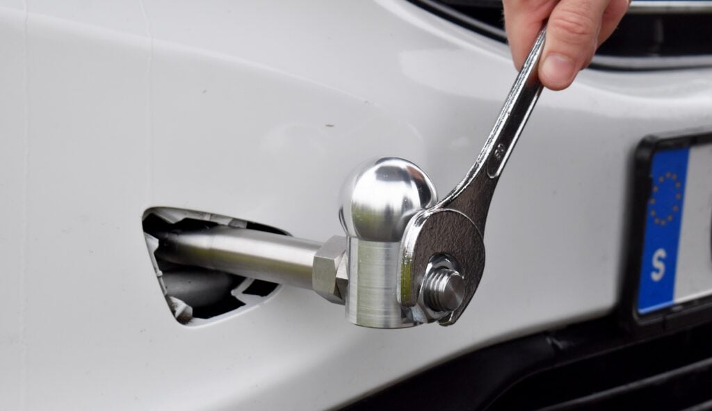 När Husvagn & Camping testar P-kulan slås vi direkt av den enkla konstruktionen. Monteringen tar endast ett par minuter, mycket tack vare att en anpassad fast nyckel medföljer. Undertecknad kör dock en Volvo XC60, alltså en medelstor SUV. Det betyder att dragöglan sitter något högre upp än på en konventionell bil.